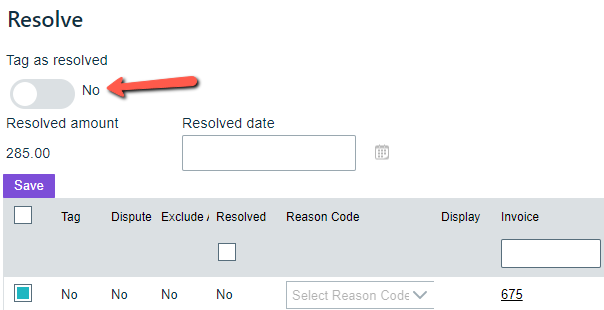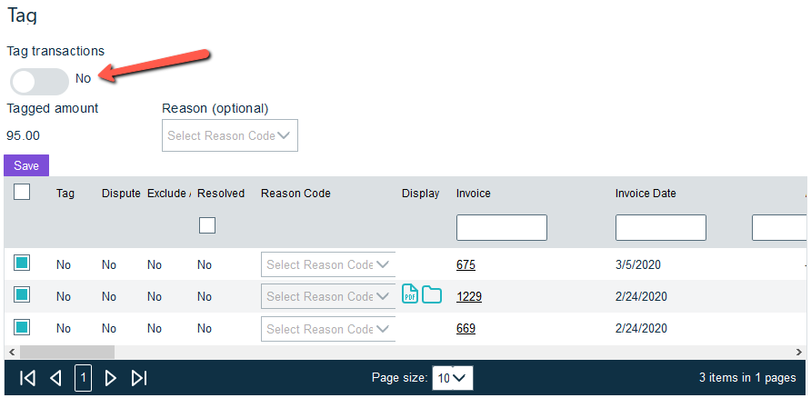 Toggle the "Tag Transactions" switch. It will say "Yes" next to the switch to notate they were properly tagged. From here, you can assign a reason code to these invoices (if desired).