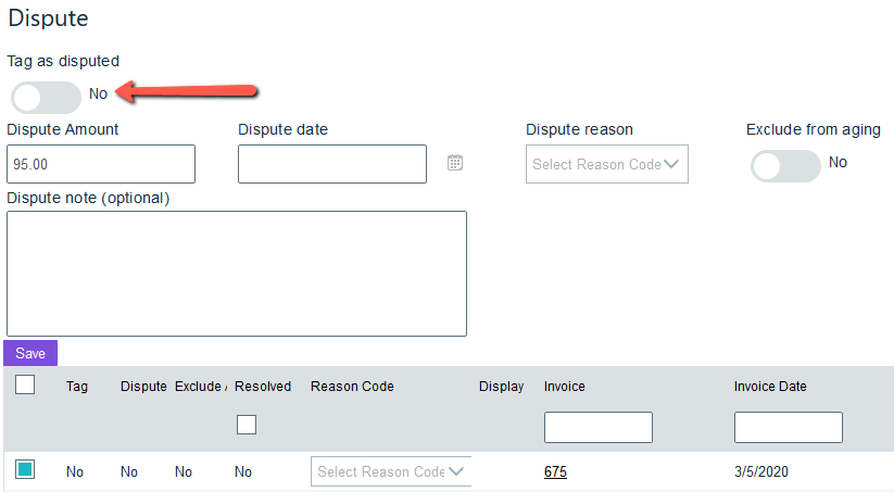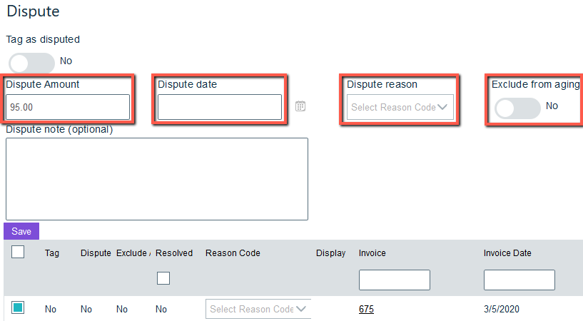 From here, enter the amount being disputed, the date it was disputed, the reason why it was disputed, and opt to exclude it from the aging buckets (optional). Afterward, enter a short note describing the dispute reason.
