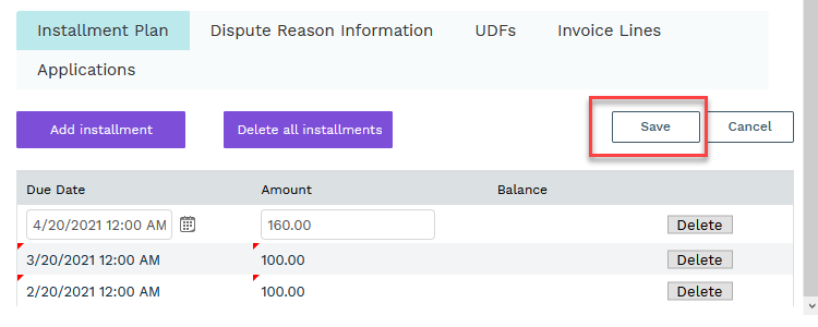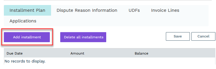 Add a due date and amount for each installment on the invoice (The remaining balance will auto fill with each subsequent record you add)