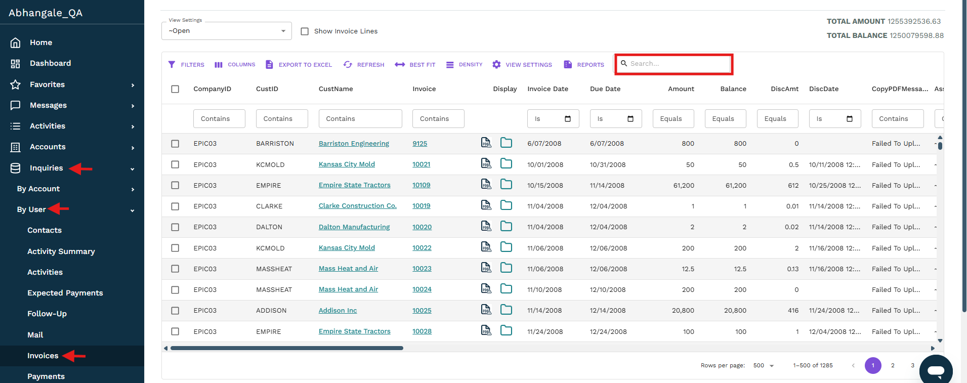 - From here, users can search off invoices by utilizing the quick search bar located on the right side of the page.