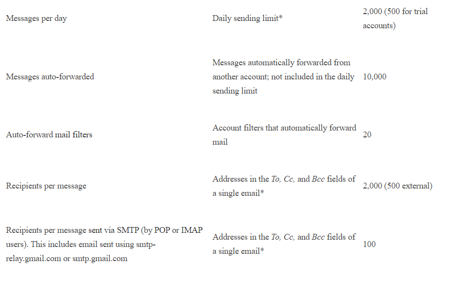 These limits may change without notice to protect Google's infrastructure. Limits per day are applied over a rolling 24-hour period rather than a set time of day.