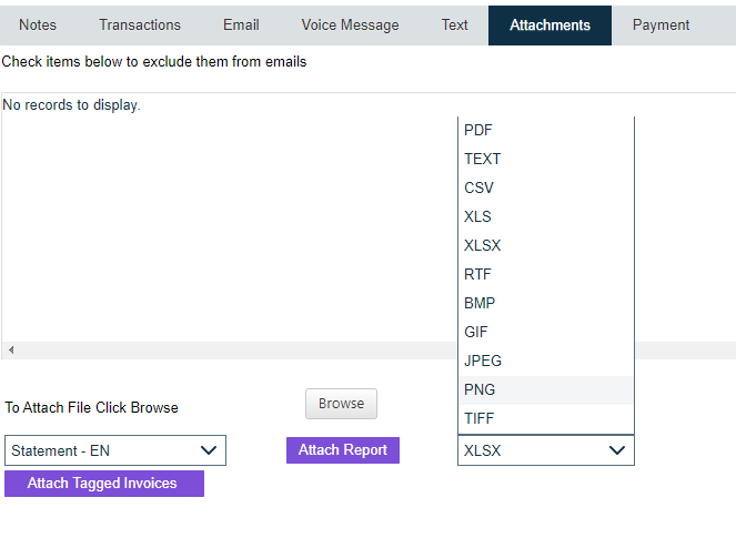 The report default file type will be set based on the report selected, but can be changed using the Report Default Output drop-down prior to clicking the Attach Report button: