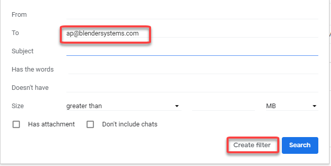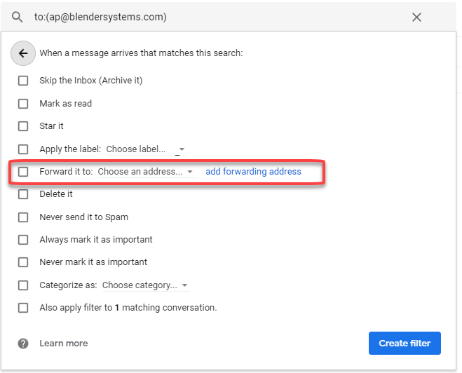 Step 4. Enter the criteria of the e-mail you want to forward - For example, we want to forward all e-mail sent to ap@blendersystems.com - so in the "Tol:" line we enter ap@blendersystems.com and "Create Filter" to proceed