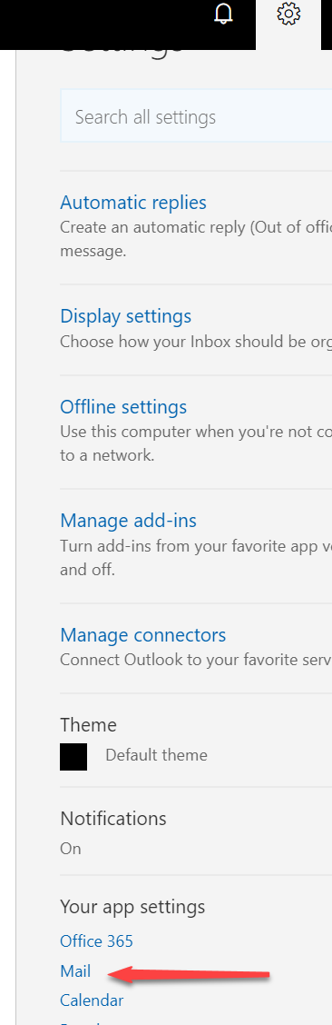 Part 1. -- In Outlook, click the gear icon in the upper right-hand corner. Scroll to the bottom of the menu and select "Mail" in the "Your app settings" section. This opens a new menu on the left side of your screen with "Mail" section expanded.